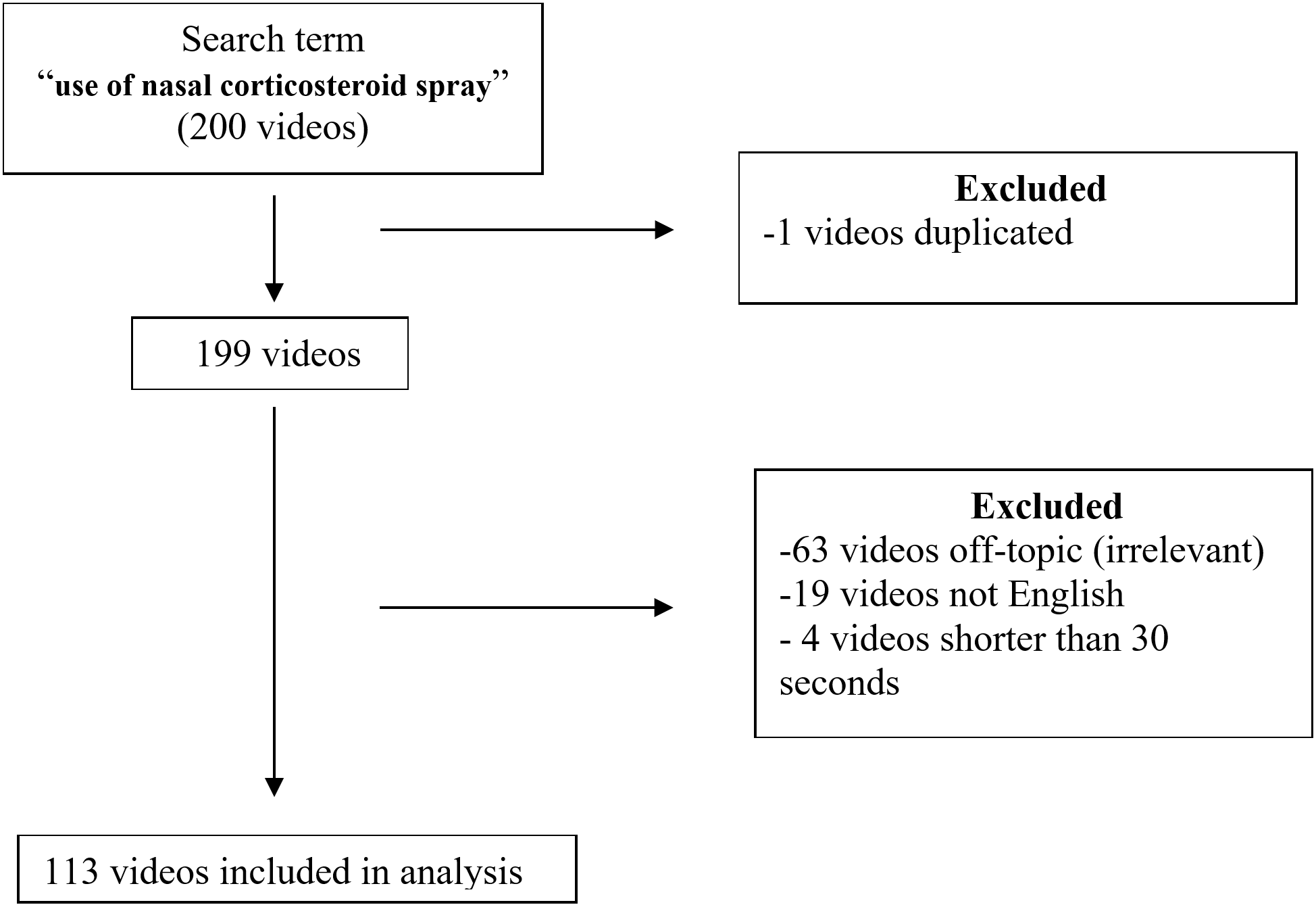 The search term ‘use of nasal corticosteroid spray’ was searched on YouTube™ (http://www.youtube.com) on March 23, 2024. A new YouTube account was created before searching to clear the search history and prevent previous search results from influencing the current search. Results were sorted by relevance using the search term in an incognito tab, and the first 200 videos viewed were saved for later evaluation. One duplicate video, 19 non-English videos, 63 irrelevant videos, and 4 videos shorter than 30 seconds were excluded from the study. The screening process for the study is shown in Figure 1.