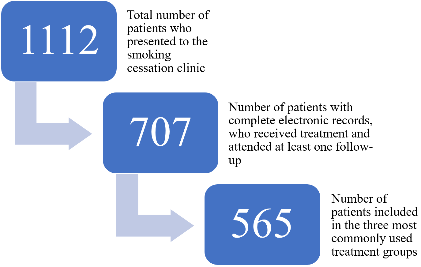 During the specified period, a total of 1.112 patients presented to the clinic. Among them, 707 patients had attended at least one follow-up visit, had used the prescribed treatment, had known smoking cessation outcomes, and had complete electronic medical records. Of these, 565 patients who received one of the three most commonly prescribed pharmacological treatments (cytisine, bupropion, or nicotine patch) were included in the analysis (Figure 1). Specifically, 252 patients treated with cytisine, 135 with bupropion, and 178 with nicotine patch were analyzed. Patients who received combination therapy were excluded from the study. Medication use was confirmed based on patient self-reports during follow-up visits and cross-checked with electronic prescription and treatment adherence notes recorded by clinicians.