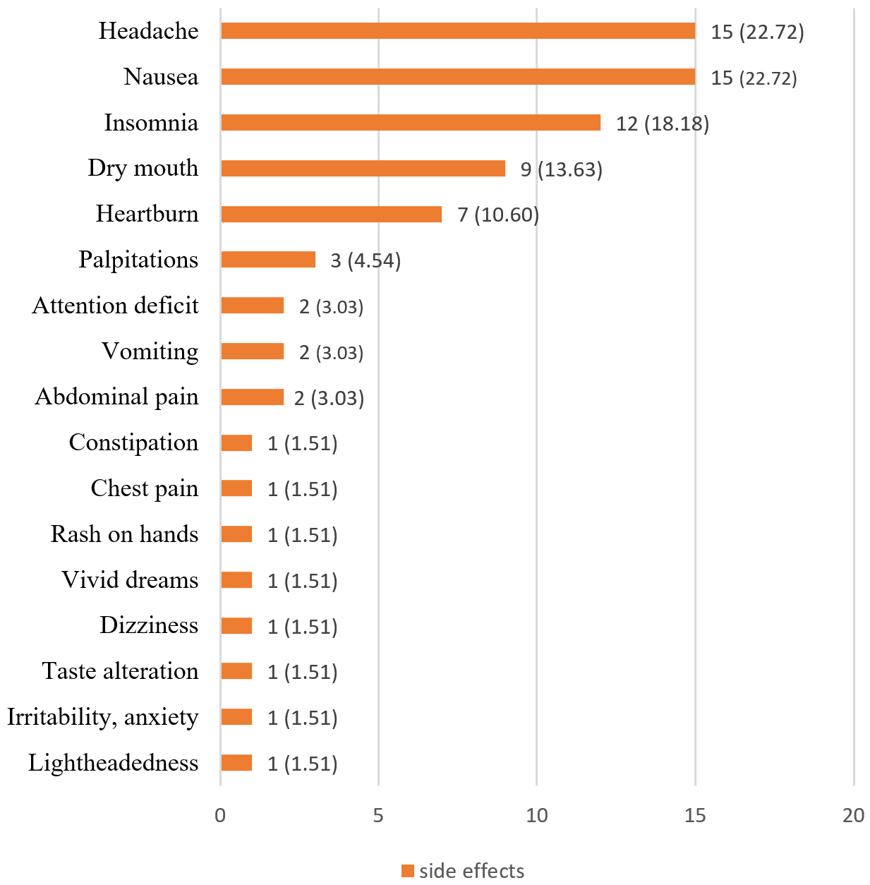 Regarding adverse effects, no side effects were reported in 191 participants (75.8%), while 61 participants (24.2%) reported at least one side effect. The most frequently reported side effects were nausea and vomiting (n=15, 22.7%), headache (n=15, 22.7%), and insomnia (n=12, 18.18%) (Figure 2). Treatment was discontinued in five participants (1.9%) due to side effects: in three cases due to nausea and vomiting, in one case due to nausea alone, and in one case due to severe insomnia lasting for three days in conjunction with nausea.