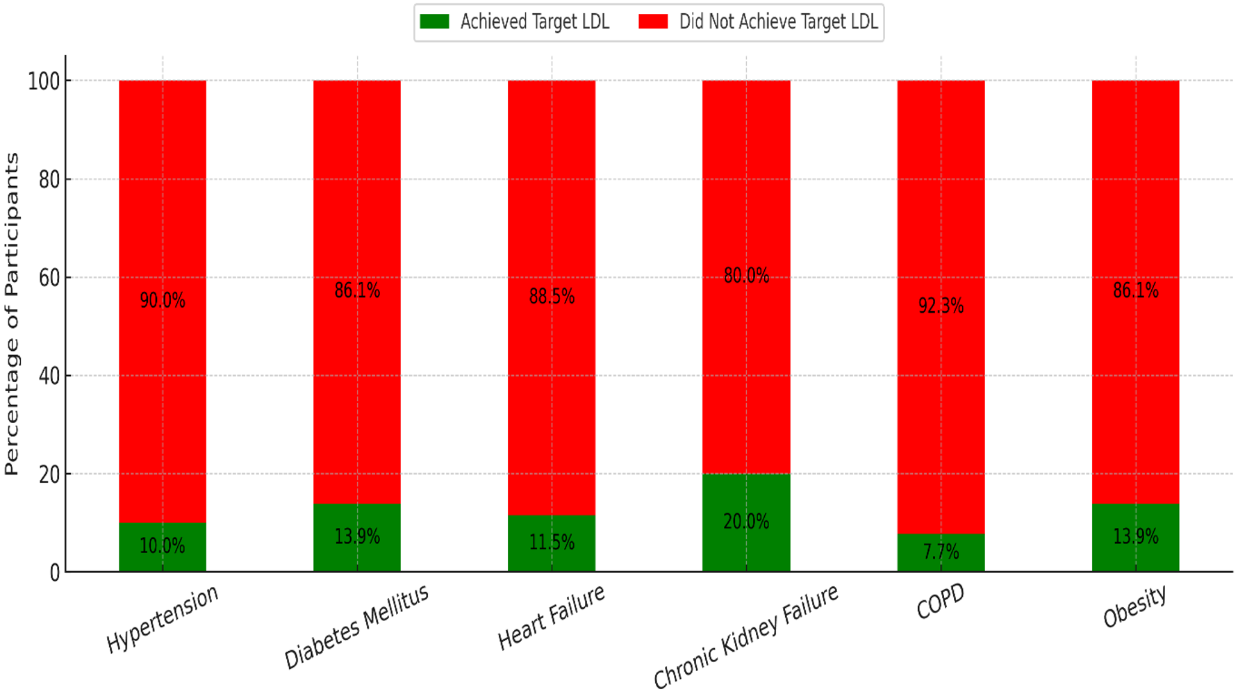 71.9% (n=240) of participants have hypertension, 56.0% (n=187) have diabetes mellitus, 15.6% (n=52) have heart failure, 12.0% (n=40) have chronic kidney failure, and 7.8% (n=26) have COPD. Figure 2 illustrates the proportion of participants achieving target LDL-C levels according to the presence or absence of various chronic diseases. Hypertension was the only condition significantly associated with lower target LDL-C attainment (p=0.012). Participants with hypertension achieved target LDL-C levels at a rate of 10.0%, compared to 20.2% in those without hypertension. Other chronic conditions, including diabetes mellitus, heart failure, chronic kidney failure, COPD, and obesity, did not show statistically significant differences in LDL-C target attainment rates (Figure 2).