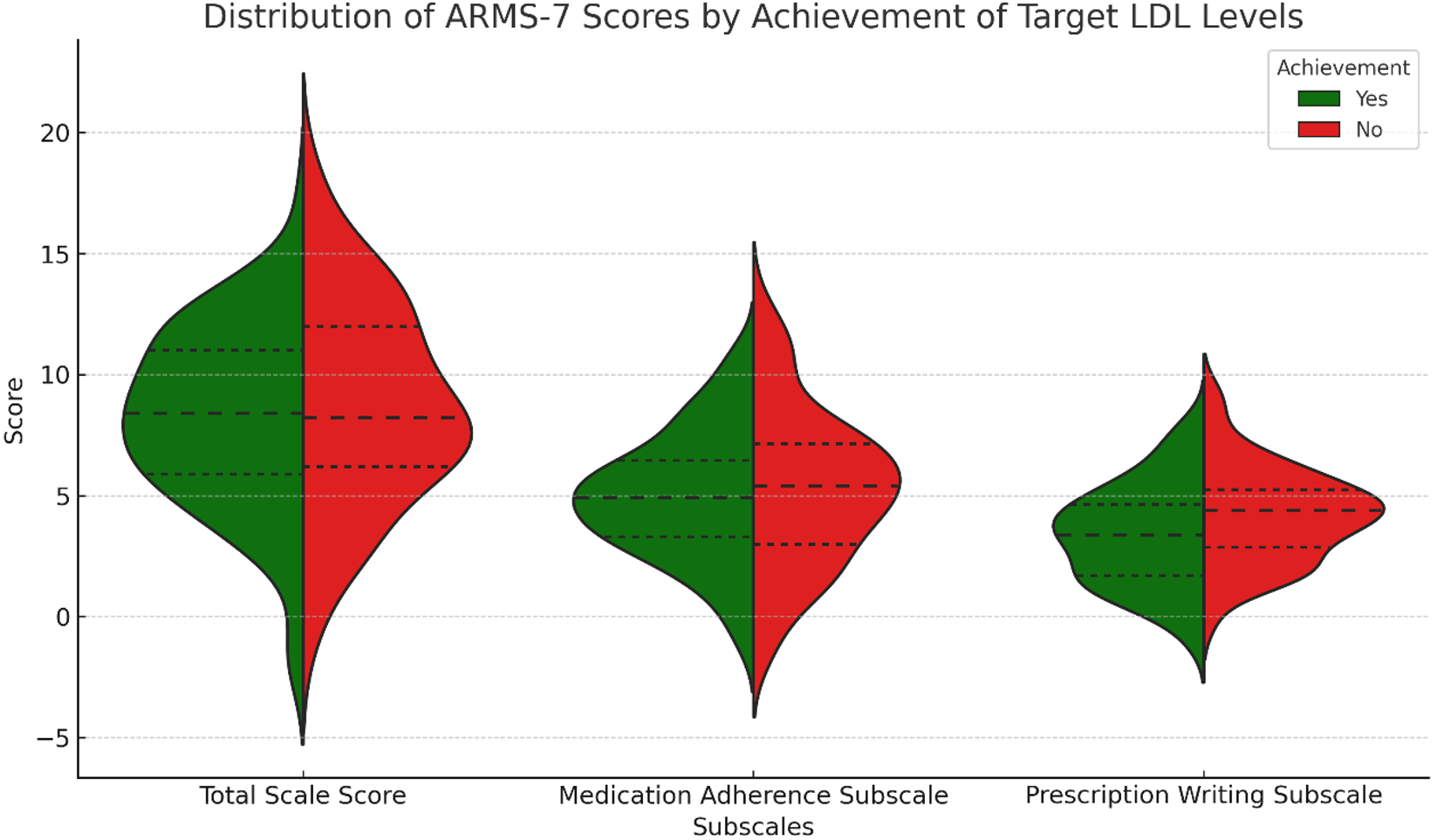 Figure 3 displays violin plots of ARMS-7 total and subscale scores by achievement of target LDL-C levels. The total score distribution was higher among patients who did not achieve target LDL-C, whereas the distributions of the medication adherence and prescription refill subscales showed no statistically significant differences between the groups (p>0.05) (Figure 3).